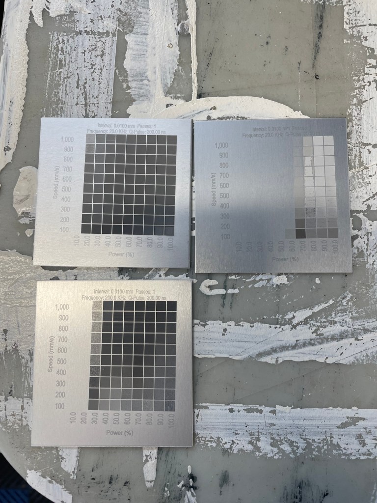 Been a bit & have had some time to muck around with this 60w MOPA fiber laser. Dialing in materials settings is interesting, as I have no fucking clue what I’m doing! Wisely provided stainless samples from this actual machine, but aluminum is a crap shoot.